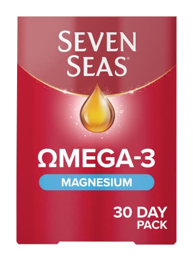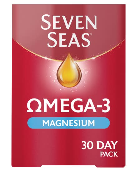 Seven Seas Omega-3 & Magnesium has been specifically developed with Omega-3 and Vitamin D to support your Brain² and Body 1-4. Omega-3 supports three major organs in the body, the heart1, brain², and eyes3. Omega-3 is essential because the body can’t produce it from scratch and can only get it through outside sources such as diet and supplements. Supports: 1Heart: EPA & DHA contributes to normal heart function* 2Brain: DHA contributes to the maintenance of normal brain function** 3Vision: DHA helps support the maintenance of normal vision** 4Bones, Muscles, Immune Support: Vitamin D contributes to the maintenance of normal bones and supports normal muscle function, normal function of the immune system and plays a role in the process of cell division. 5Magnesium contributes to normal energy-yielding metabolism. It also contributes to the reduction of tiredness and fatigue, normal muscle function and maintenance of normal bones. 6Source 2025 NIQ data, Value and Units, Vitamins & Minerals (Client Defined), 52 w/e 11.01.25, Total UK. Verify at seven-seas.co.uk/contact. The beneficial effect for the heart is obtained with a daily intake of 250 mg EPA and DHA. The beneficial effects for brain and vision are obtained with a daily intake of 250 mg DHA. How to use: Dosage: Take one Omega-3 capsule and one Magnesium tablet a day with a glass of cold water during a meal. Contains fish oil and beef gelatine. Box - Recycle. Blister - Don't Recycle. Food supplements must not replace a balanced diet and healthy lifestyle. • Procter & Gamble Health Ltd., The Heights, Brooklands, Weybridge, Surrey, KT13 0XP, United Kingdom. • Packaging: Reusable