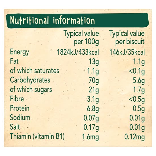 Ingredients: Wheat Flour 36.6%, Fruit Filling 20.0%, (Apple Juice Concentrate 68%, Apple Puree Concentrate 20%, Strawberry Puree 12%), Wholegrain Wheat Flour 15.7%, Grape Juice Concentrate 12.4%, Rapeseed Oil 11.0%, Corn Fibre 4.1%, Raising Agent (Sodium Bicarbonate)* 0.2%, Thiamin (Vitamin B1)* <0.1%, Total 100%, *Raising Agent (Sodium Bicarbonate) and Thiamin (Vitamin B1) have no Organic certification Contains: Milk, Nuts, Wheat