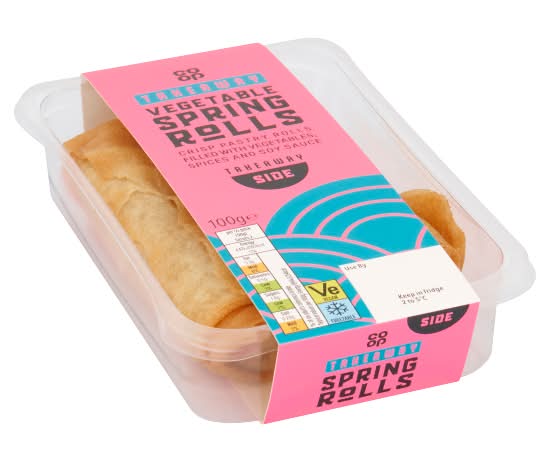 Co-Op Vegetable Spring Rolls are crisp pastry rolls generously filled with a mix of carrot, cabbage, beansprouts, red pepper, baby sweetcorn, and water chestnuts, offering a blend of textures and flavors. Each 100g pack contains rolls that are ready to be cooked to golden perfection, making them a convenient choice for a quick appetizer or a complement to any meal. • Co-op (Gb) / Co-op (Ni), M60 0AG. • Packaging: Reusable