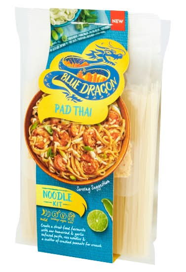 Pad Thai is a light and fragrant noodle dish with tamarind, garlic, peanuts and shallots. Kit contains individual sachets of Pad Thai paste, rice noodles and crushed peanuts. Only three quick and easy steps are needed to create this mild street food classic. The secret to great Thai dishes is the freshness and balance of Thai ingredients that are ground into paste. At Blue Dragon, we grind our paste in Thailand to capture all the rich flavours. Don't forget your prawns, spring onions, beansprouts and an egg. • Ab World Foods Ltd., Kiriana House, Kiribati Way, Leigh, Lancashire, WN7 5RS. • Packaging: Reusable