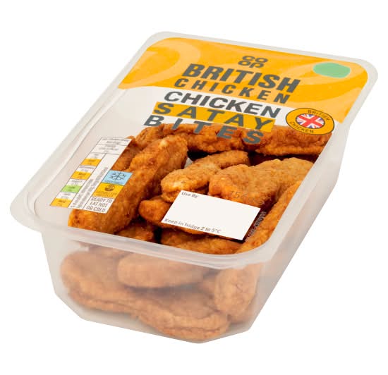 Cooked chopped and formed chicken blended with satay seasoning and fried. British Chicken Ready to Eat Hot or Cold • Co-op (GB), Manchester, M60 0AG. • Packaging: Reusable