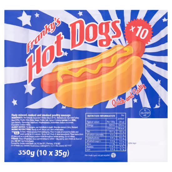 Frankys Hot Dogs offer a finely minced, cooked, and smoked poultry sausage, providing a quick and tasty option suitable for various meals or snacks. Golden Acre Foods Ltd, PO Box 3311,Chertsey,KT16 6EJ.