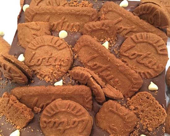 A tempting milk chocolate slab covered in lotus biscoff caramelized biscuits, lotus biscoff original sandwich biscuits and white chocolate chips. The block is made of 100% finest Belgian chocolate.