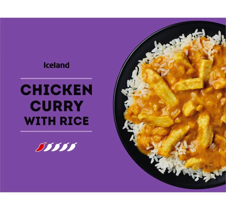 Cooked chicken strips in a mild curry sauce served with cooked long grain rice. Iceland Foods Ltd., U.K, CH5 2NW