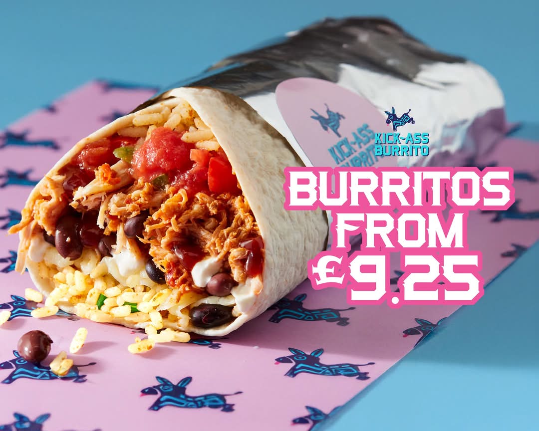 View upfront pricing information for the various items offered by Kick-Ass Burrito (Camberley) here on this page.
