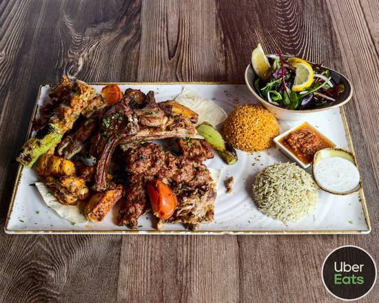 8 cuts of meat: chicken wings, Adana lamb and chicken kebab, lamb shish, chicken shish, lamb ribs, lamb and chicken döner, bulgur pilav, basmati rice, bread, mixed salad.