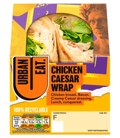 Wrapped in a plain tortilla, the Urban Eat Chicken Caesar Wrap combines steamed chicken breast with crisp lettuce and beechwood smoked bacon, all brought together with a Caesar mayonnaise. • Samworth Brothers Group, PO Box 10466, Melton Mowbray, LE13 9EX. • Packaging: Reusable