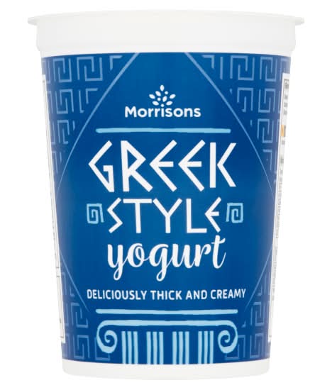 Greek style natural yogurt. British Milk Deliciously Thick and Creamy Suitable for vegetarians. • Wm Morrison Supermarkets Limited, Gain Lane, Bradford, BD3 7DL. • Packaging: Reusable