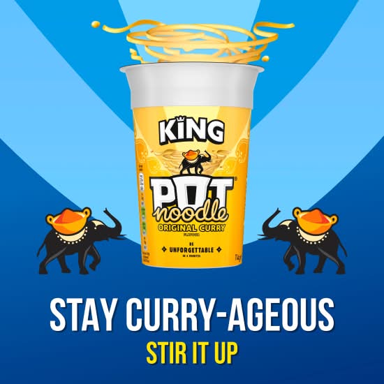 Try the nation's favourite instant noodle brand Pot Noodle. King Pot Noodle Original Curry features an sauce with vegetables and a little sachet of sweet mango chutney. Sounds deliciously Asian right? Plus it's dead easy to make and it only takes 4 minutes so even if you aren't a master chef you can make it. If you're hungry and looking for a quick convenient and tasty solution that will fill you up we've got the noodles for you. Stir it up How to make it yourself? It's simple and quick. Rip off the lid. Whip out the sachet. Add boiling water to fill level and re-cover with the lid. Leave alone for 2 minutes, then give it a stir before leaving for another 2 minutes. Finally give it another stir as you add the pot noodle flavour sachet and dig in Make sure to seize your opportunity and strike while the pot's hot - do not reheat. Don't forget to recycle the packaging - the lid and pot are both recyclable. Both cleverly convenient and deviously delicious our curry noodles have none of that artificial colour or preservative stuff and are suitable for vegetarians. Eat them up with NO worries. We know our Pot is already perfect, but try adding some diced tomatoes to switch it up a bit. • Flavour: Original curry • Unilever UK Ltd, Pot Noodle, Freepost ADM3940, London, SW1A 1YR.