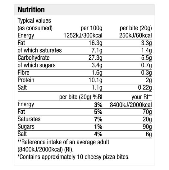 Directions for use: Keep Frozen Oven cook - From Frozen Cooking appliances vary. These instructions are given as a guide. Please ensure that the product is piping hot throughout before serving. Do not reheat. 200°C, Fan 180°C, Gas 6, 15 min Pre-heat your oven as shown. Remove all packaging. Spread pizza bites evenly on a baking tray and place in the centre of the oven. Allow to stand for 1 minute before serving. Storage recommendation: Keep frozen. Food freezer **** * Until best before date Frozen food compartment *** * Until best before date Frozen food compartment ** One month Frozen food compartment * One week Ice making compartment Three days * Should be -18°C or colder Once thawed, do not refreeze Frozen