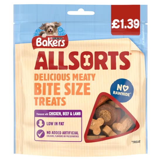 Baker's Allsorts Delicious Meaty Bite Size Treats Flavoured With Chicken, Beef & Lamb (98g)