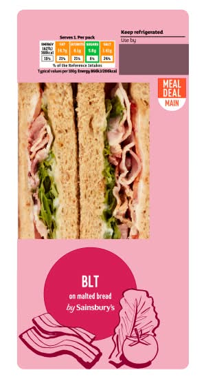 Ingredients: Tomatoes (17%), Beechwood Smoked Bacon (16%) (Pork Belly, Sugar, Salt, Antioxidant: Sodium Ascorbate; Preservative: Sodium Nitrite), Mayonnaise (Water, Rapeseed Oil, Cornflour, Spirit Vinegar, Pasteurised Free Range Egg Yolk, Concentrated Lemon Juice, Sugar, White Wine Vinegar, Salt, Mustard Seeds), Lettuce (8%) Contains: barley, eggs, mustard, wheat
