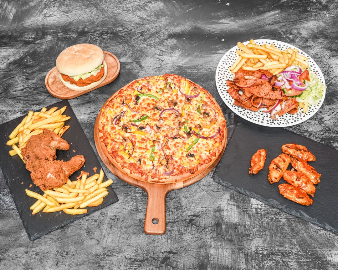 Our Pizzas Are Made With 100% Dairy Cheese And Fresh Ingredients, Using No Frozen Dough. Choose Deep Pan Or Thin Crust. Sizes: 9" (6 Slices), 12" (8 Slices), 15" (12 Slices). Choose From Garlic, BBQ, Sweet Chilli, Or Hot Chilli Base.Burgers