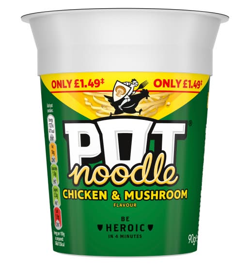 Hungry but short on time? For a classic flavour combination, try Standard Pot Noodle Chicken & Mushroom from the nation's favourite instant noodle brand*. It's our classic noodles in a chicken and mushroom flavour sauce with vegetables and a little sachet of soy sauce. Sounds delicious, right? Plus, it's dead easy to make and it only takes 4 minutes, so even if you aren't a master chef, you can make it. If you're hungry and looking for a quick, convenient and tasty solution, we've got the noodles for you. Stir it up! How to make it yourself? It's simple and quick. Rip off the lid. Whip out the sachet. Add boiling water to fill level and re-cover with the lid. Leave alone for 2 minutes, then give it a stir before leaving for another 2 minutes. Finally, give it another stir as you add the pot noodle flavour sachet and dig in! Make sure to seize your opportunity and strike while the pot's hot - do not reheat. Don't forget to recycle the packaging - the lid and pot are both recyclable. Both cleverly convenient and deviously delicious, our mushroom and chicken noodles have none of that artificial colour or preservative stuff and are suitable for vegetarians. Eat them up with NO worries. *Nielsen Retail Measurement Service for the Mini Meals - Pot snacks segment for the 52-week period ending 16/08/2022. • Flavour: Chicken-mushroom • Unilever UK Ltd. / Unilever Ireland Ltd., Unilever UK, Pot Noodle, Freepost ADM3940, London, SW1A 1YR.