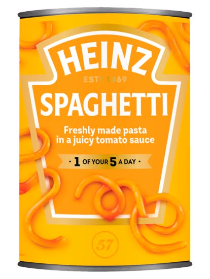 Our delicious Heinz Spaghetti in a juicy tomato sauce have been bringing smiles to mealtimes for generations. Truly, it's unspaghettible. Enjoy the great taste of our pasta on its own or on toast, it is the perfect meal for kids and grown-ups alike! Our tinned Heinz Spaghetti in tomato sauce doesn’t just taste great but is low in fat too! 1 of your 5 a day in half a can when eaten as part of a balanced diet. Our Spaghetti contains no artificial colours, flavours or preservatives. Suitable for vegetarians. A whole tomato has been squeezed into every portion! ‘Cos when it comes to the food you love… well, it has to be Heinz. Try the rest of our canned Heinz pasta range, including Macaroni Cheese, Spaghetti Bolognese or our Spaghetti Hoops No Added Sugar! Pack size: 400G Can - Metal - widely recycled • H.J. Heinz Foods UK Ltd., London, SE1 9SG. • Packaging: Reusable