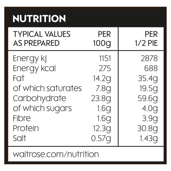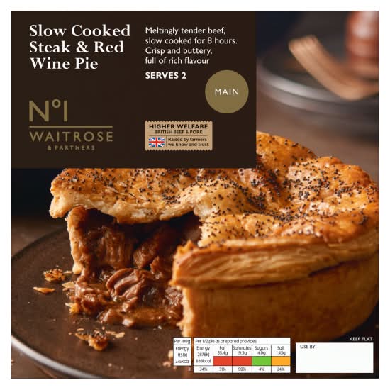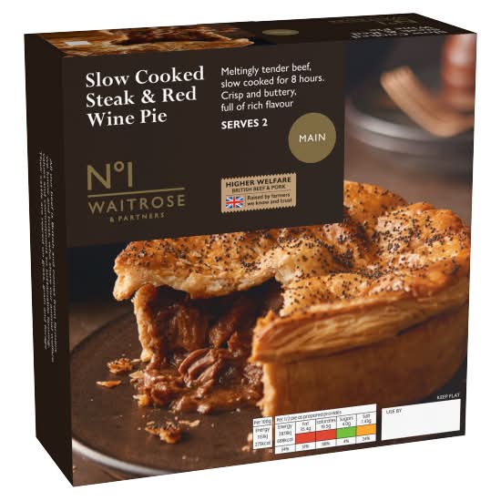 Filled with beef cooked for 8 hours so it's melt-in-the-mouth tender, rich red wine gravy with the cooking juices stirred in, and onions sautéed in beef dripping for extra flavour. All inside crumbly shortcrust, topped with proper puff pastry made with butter and expertly rolled and folded for crisp, flaky layers. Delicious with creamy mash and steamed greens • Waitrose Limited, Bracknell, Berkshire, RG12 8YA, UK. • Packaging: Reusable