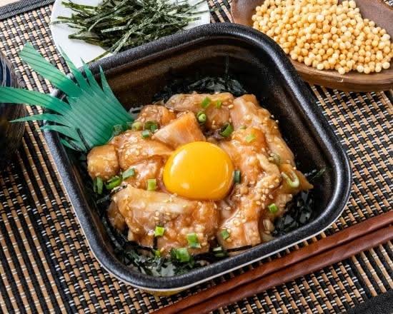 サーモンぶつに、特製ユッケダレを絡めて、卵黄をのせました。