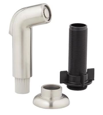 Update your current side spray to this traditional design with a Stainless Steel finish. The Kitchen Side Spray features a stylish design that will give your fixtures a newly updated look. It is crafted from a durable plastic construction that will endure the rigors of everyday use. It may be used to rinse dishes and sinks as it extends the flow of water from a faucet. It replaces thumb-control spray-head and provides high pressure directional power spraying. This spray head has a universal design and fits various faucet brands giving it maximum compatibility.