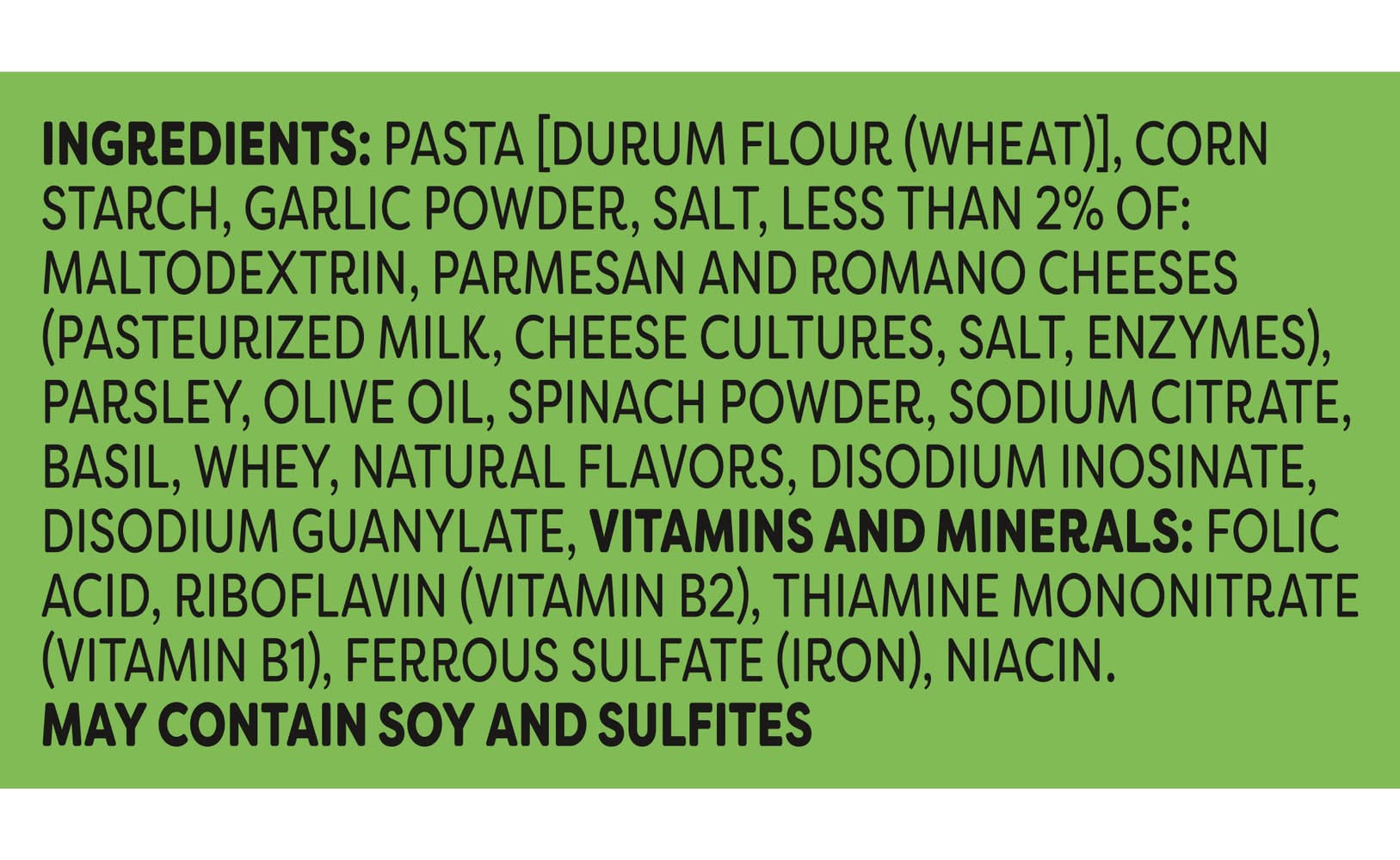 Pasta [Durum Flour (Wheat)], Corn Starch, Garlic Powder, Salt, Less than 2% of: Maltodextrin, Parmesan and Romano Cheeses (Pasteurized Milk, Cheese Cultures, Salt, Enzymes), Parsley, Olive Oil, Spinach Powder, Sodium Citrate, Basil, Whey, Natural Flavors, Disodium Inosinate, Disodium Guanylate, Vitamins and Minerals: Folic Acid, Riboflavin (Vitamin B2), Thiamine Mononitrate (Vitamin B1), Ferrous Sulfate (Iron), Niacin. Contains: Wheat, Corn, Milk, Soybeans, Sulfites Additives: None