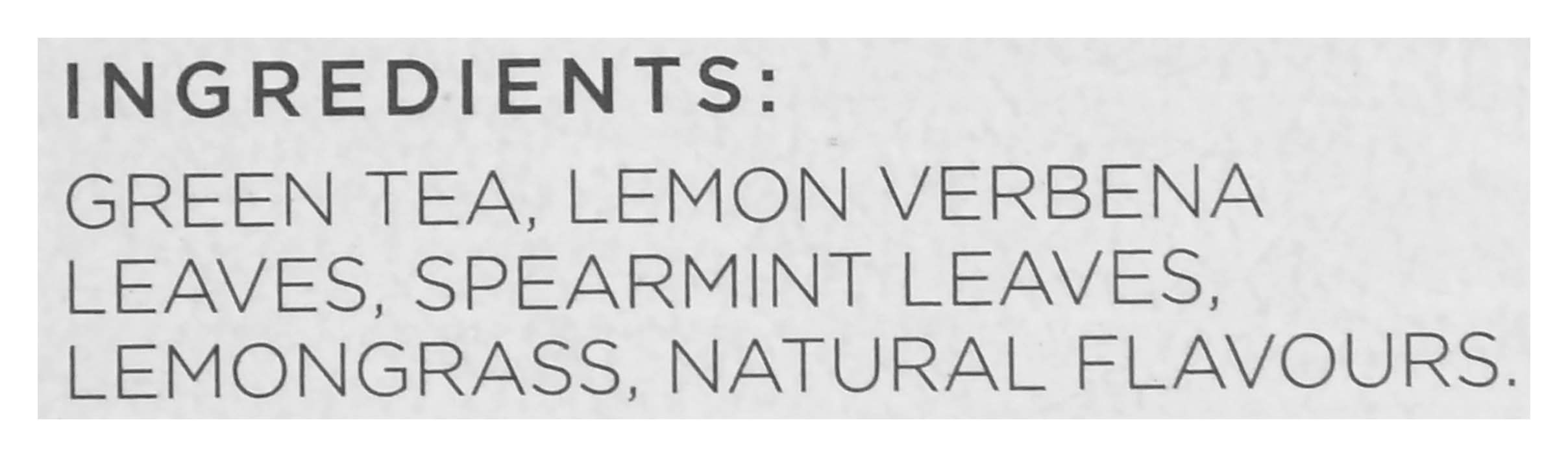 Green Tea, Lemon Verbena Leaves, Spearmint Leaves, Lemongrass, Natural Flavours