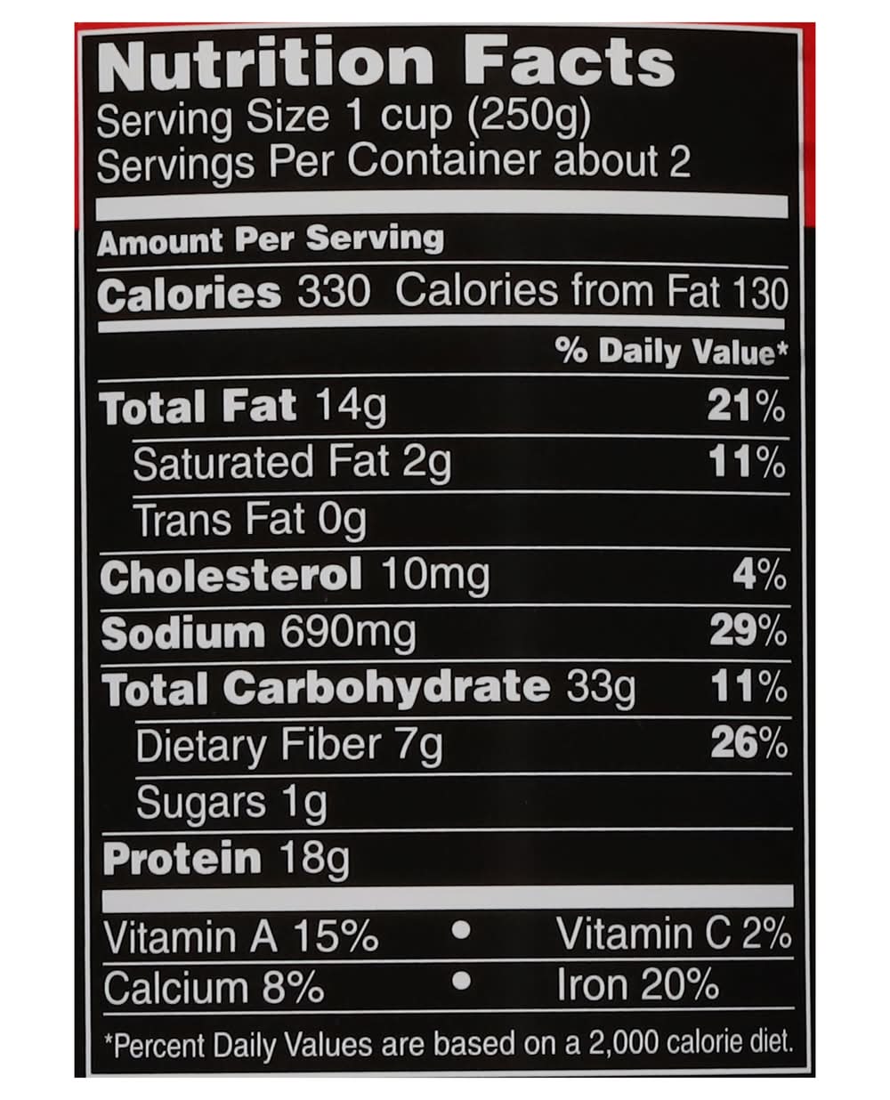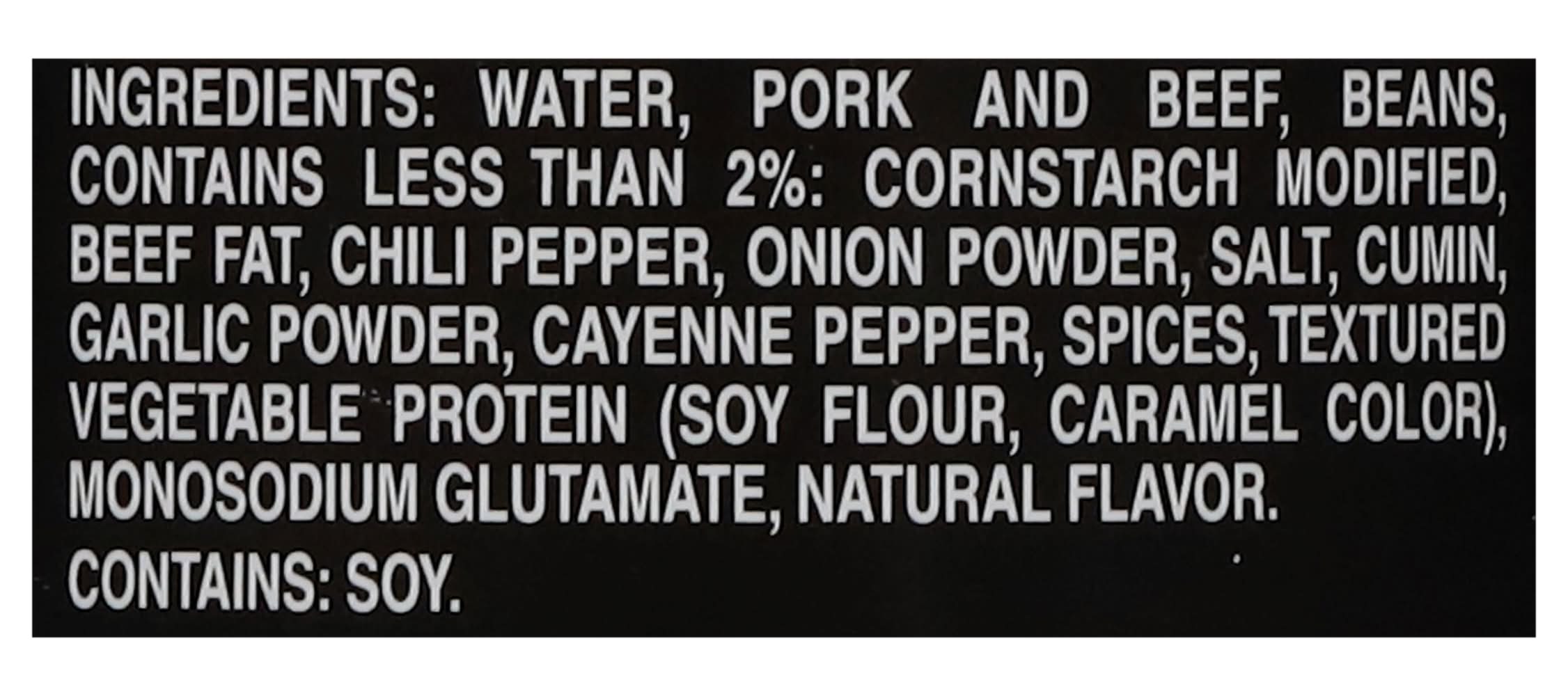 Water, Pork and Beef, Beans, Contains Less than 2%: Cornstarch Modified, Beef Fat, Chili Pepper, Onion Powder, Salt, Cumin, Garlic Powder, Cayenne Pepper, Spices, Textured Vegetable Protein (Soy Flour, Caramel Color), Monosodium Glutamate, Natural Flavor Contains: Corn, Soybeans