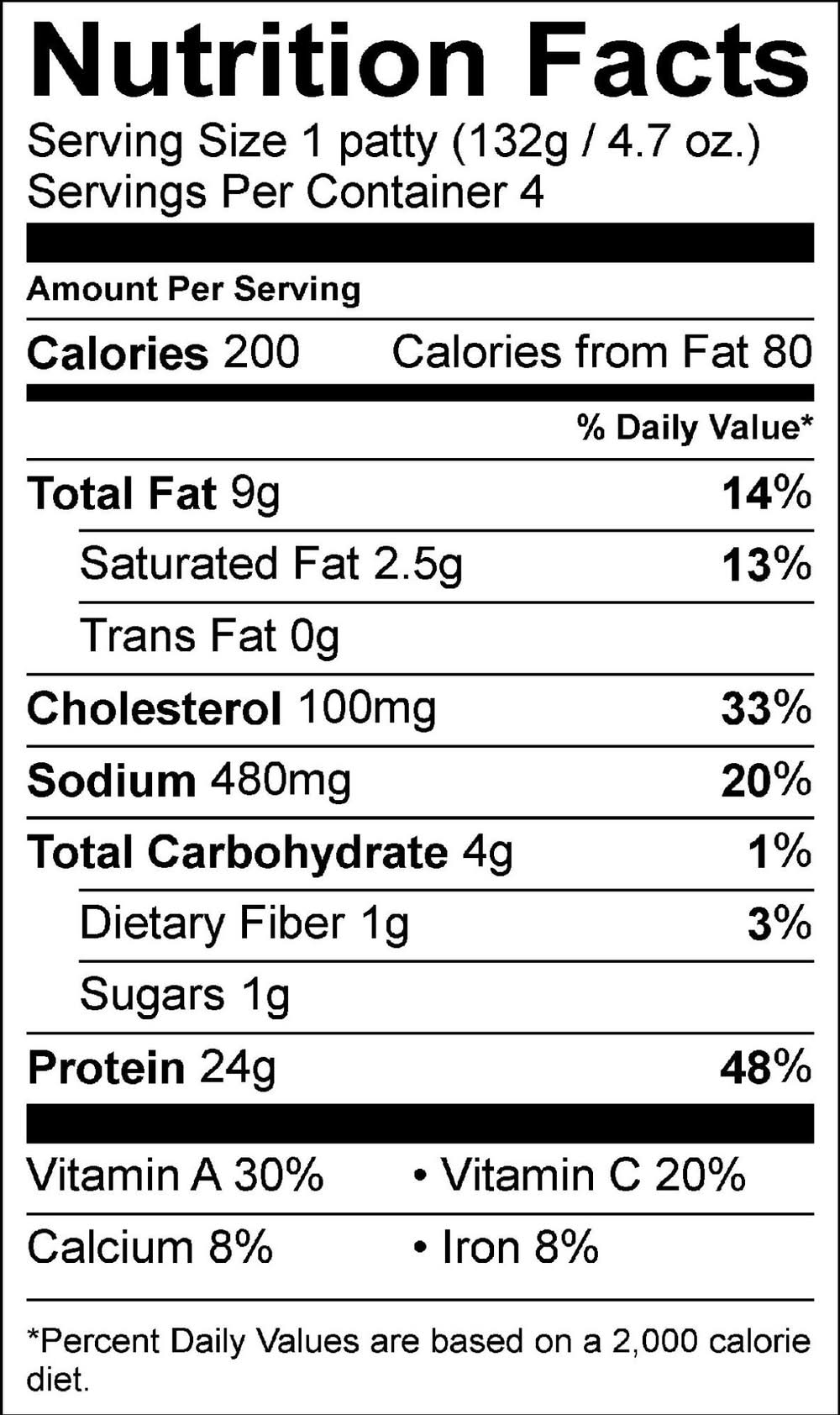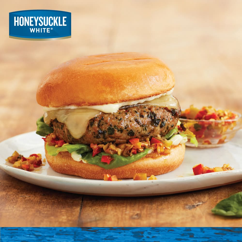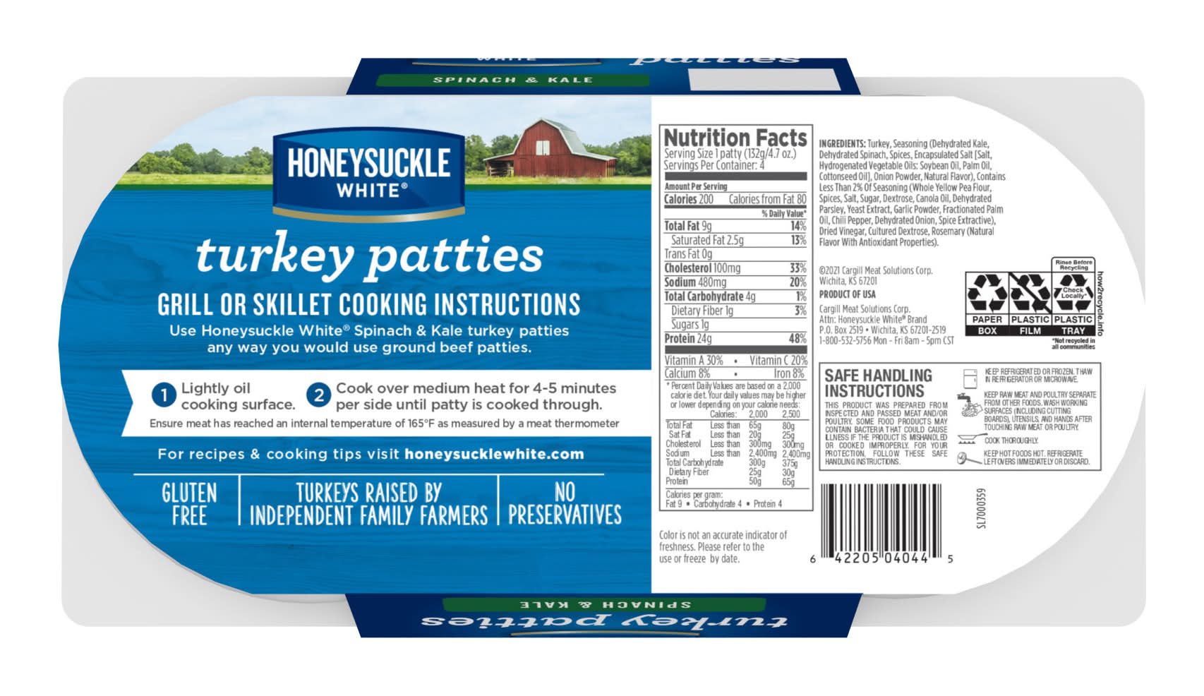 Our flavorful Spinach and Kale Turkey Patties are great for an easy and convenient, prep-free meal on the stove or the grill. Every Honeysuckle White® Spinach and Kale Turkey Patty Tray is bursting with flavor and packed with spinach, kale and 24g of protein per serving. Honeysuckle White® turkeys are raised by independent farmers with no growth-promoting antibiotics, added hormones or steroids. When you enjoy Honeysuckle White®, you’re a part of how good feeds good. All fresh turkey products are naturally gluten free. • Cargill Meat Solutions Corp, Wichita, KS, 67201 • Packaging: Reusable