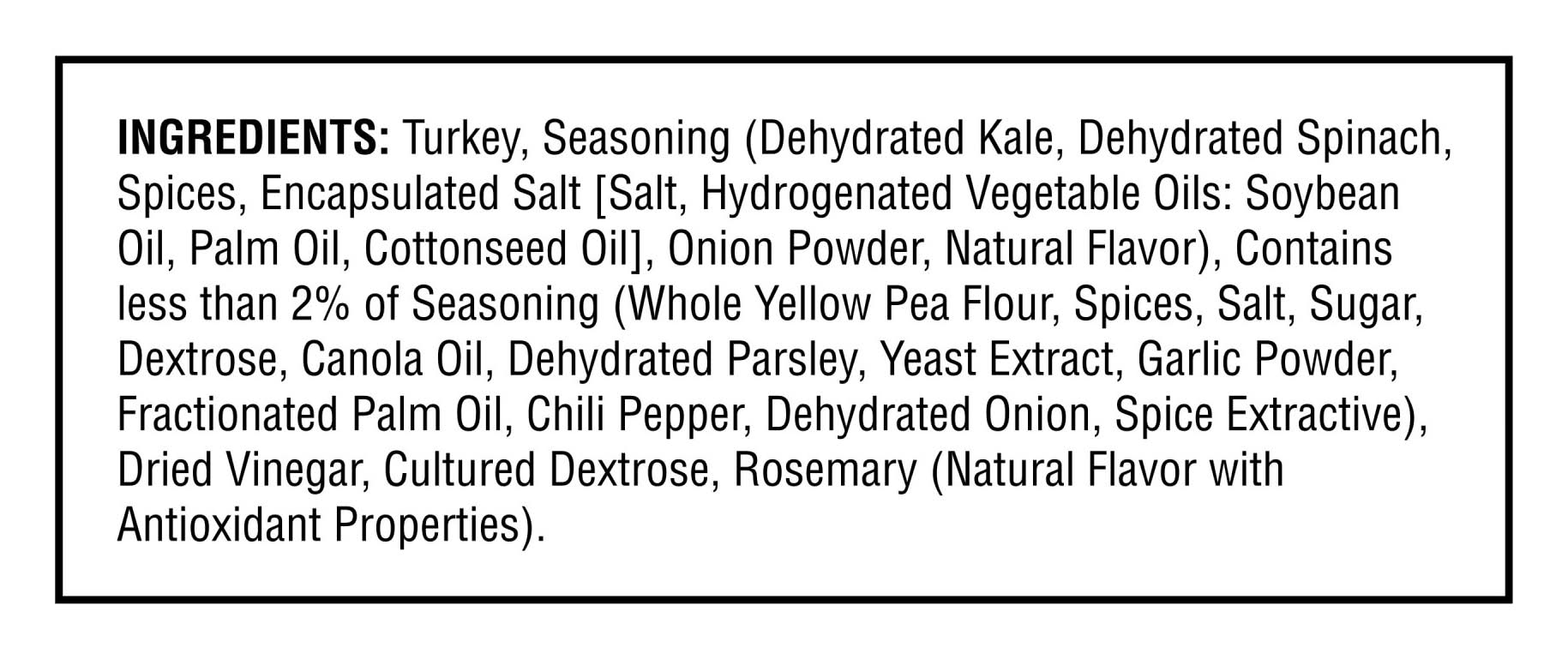 Turkey, Seasoning (Dehydrated Kale, Dehydrated Spinach, Spices, Encapsulated Salt [Salt, Hydrogenated Vegetable Oils: Soybean Oil, Palm Oil, Cottonseed Oil], Onion Powder, Natural Flavor), Contains less than 2% of Seasoning (Whole Yellow Pea Flour, Spices, Salt, Sugar, Dextrose, Canola Oil, Dehydrated Parsley, Yeast Extract, Garlic Powder, Fractionated Palm Oil, Chili Pepper, Dehydrated Onion, Spice Extractive), Dried Vinegar, Cultured Dextrose, Rosemary (Natural Flavor with Antioxidant Properties), . Contains: 'Contains Soybeans' Additives: None