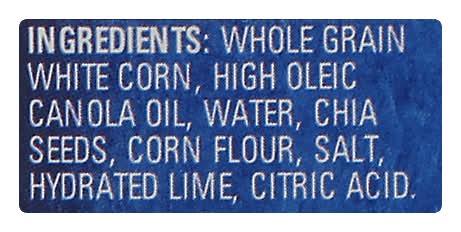Whole Grain White Corn, High Oleic Canola Oil, Water, Chia Seeds, Corn Flour, Salt, Hydrated Lime, Citric Acid