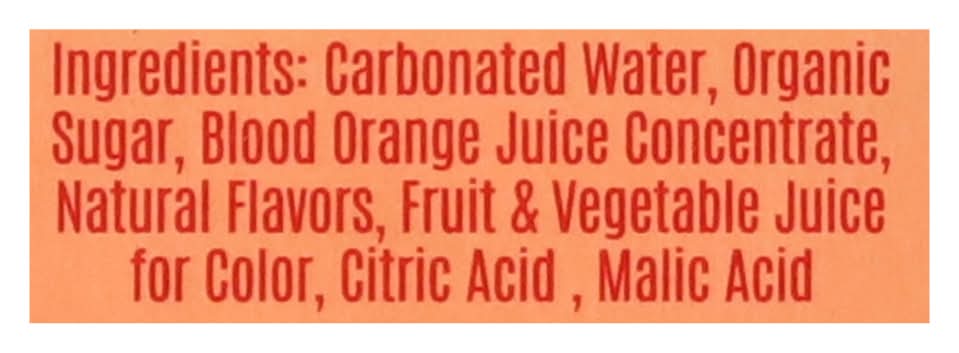 Carbonated Water, Organic Sugar, Blood Orange Juice Concentrate, Natural Flavors, Fruit & Vegetable Juice for Color, Citric Acid, Malic Acid Contains: None Additives: None
