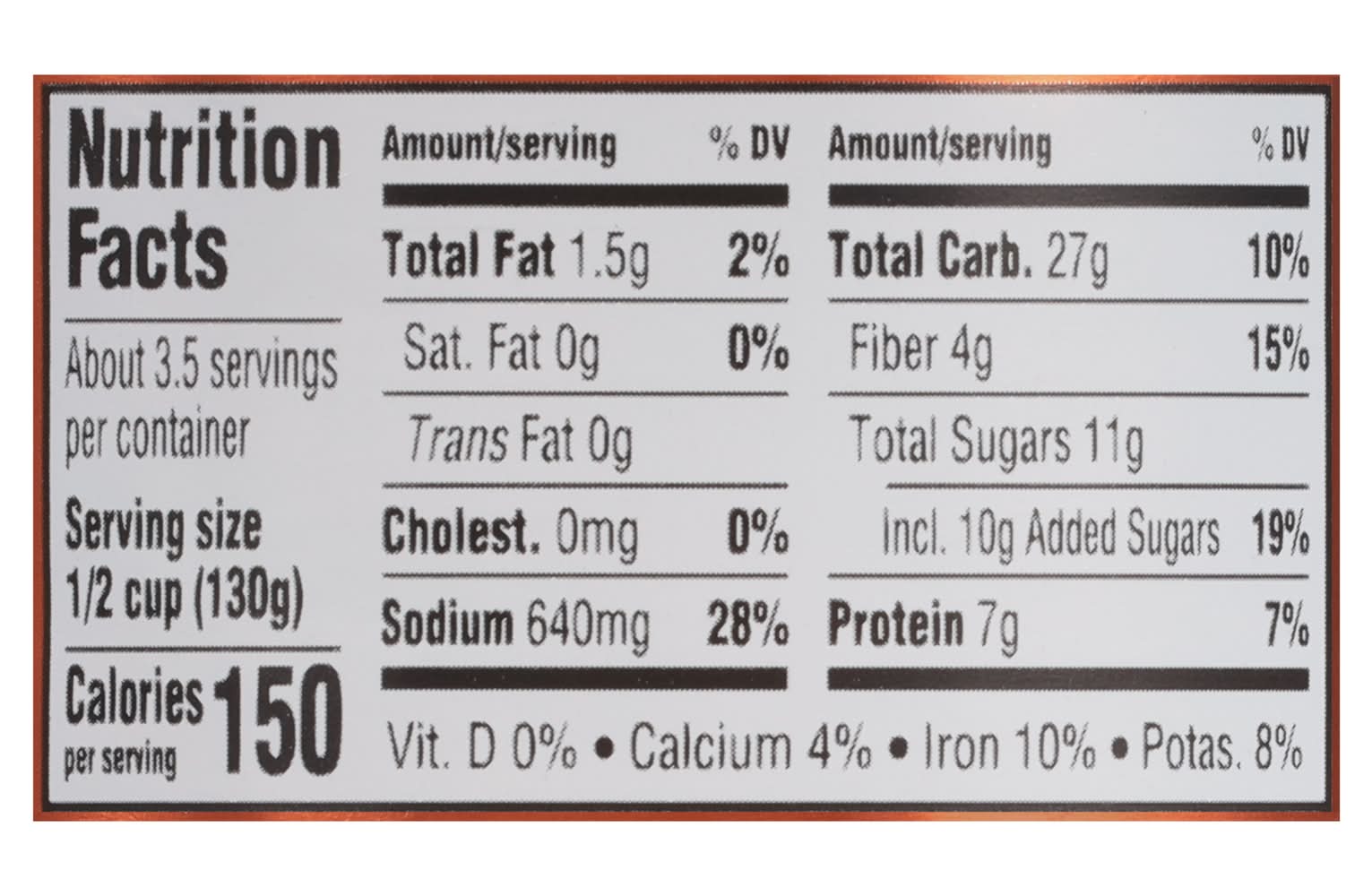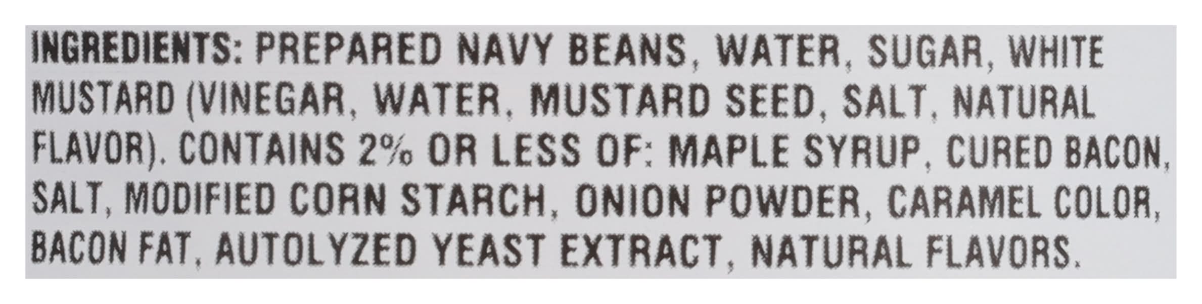 Ingredients: Prepared Navy Beans, Water, Sugar, White Mustard (Vinegar, Water, Mustard Seed, Salt, Natural Flavor). Contains 2% or less of: Maple Syrup, Cured Bacon, Salt, Modified Corn Starch, Onion Powder, Caramel Color, Bacon Fat, Autolyzed Yeast Extract, Natural Flavor. Contains: Mustard, Corn