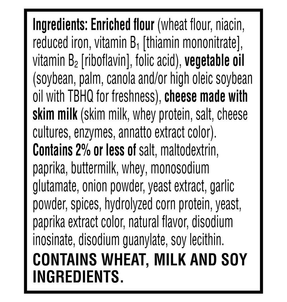 Ingredients: Enriched Flour (Wheat Flour, Niacin, Reduced Iron, Vitamin B1 [Thiamin Mononitrate], Vitamin B2 [Riboflavin], Folic Acid), Vegetable Oil (Soybean, Palm, Canola and/or High Oleic Soybean Oil with TBHQ for Freshness), Cheese Made with Skim Milk (Skim Milk, Whey Protein, Salt, Cheese Cultures, Enzymes, Annatto Extract Color). Contains 2% or Less of Salt, Maltodextrin, Paprika, Buttermilk, Whey, Monosodium Glutamate, Onion Powder, Yeast Extract, Garlic Powder, Spices, Hydrolyzed Corn Protein, Yeast, Paprika Extract Color, Natural Flavor, Disodium Inosinate, Disodium Guanylate, Soy Lecithin Contains: Wheat, Soybeans, Milk