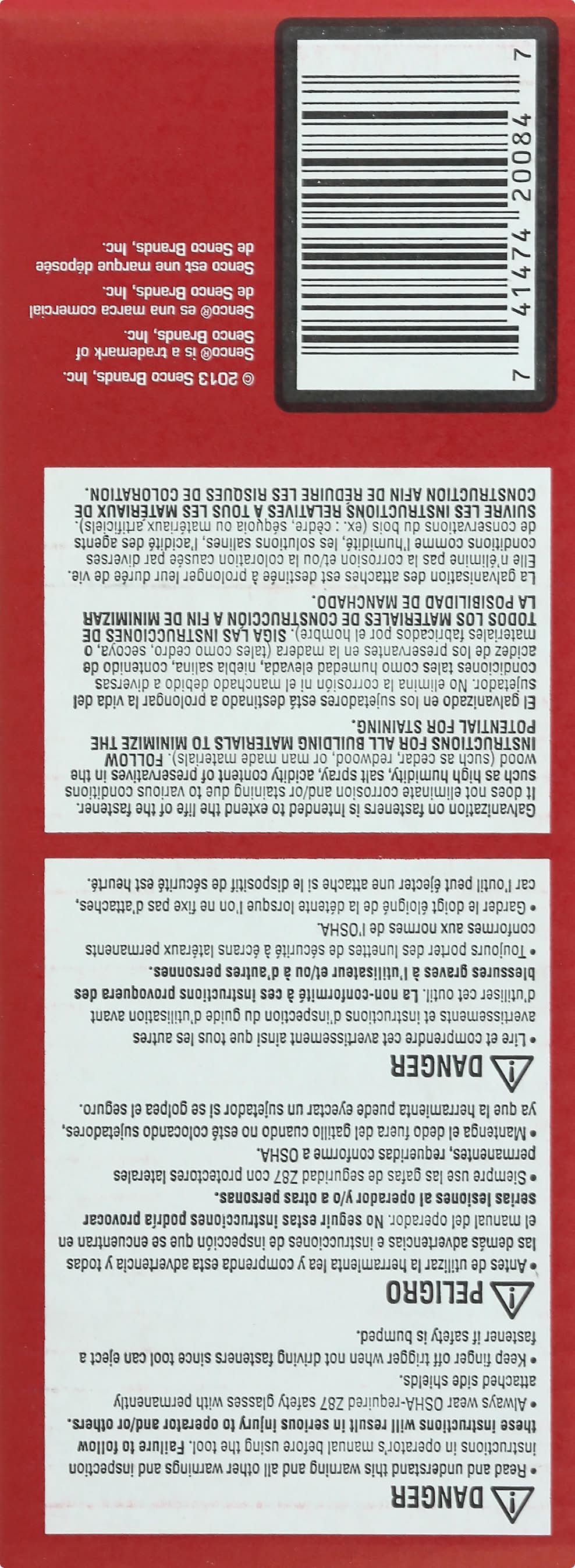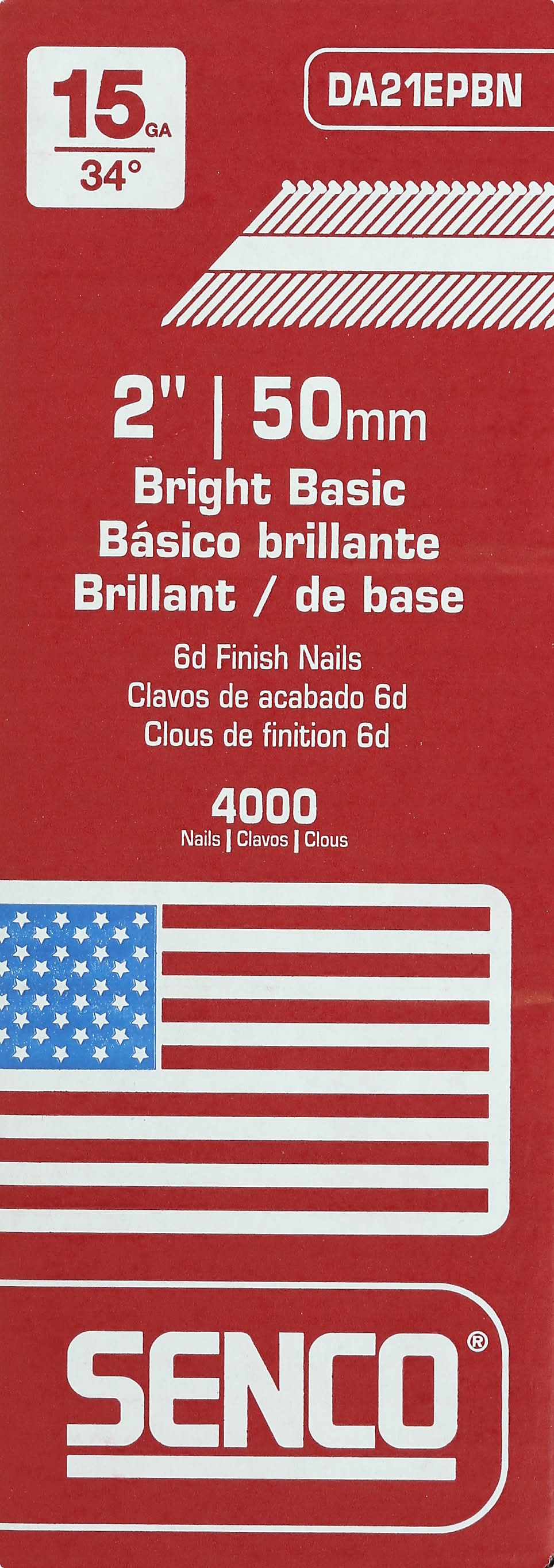 15 GA. 34 degrees. 2 inches. 50 mm. Fits other tools. Galvanization on fasteners is intended to extend the life of the fastener. It does not eliminate corrosion and/or staining due to various conditions such as high humidity, salt spray, acidity content of preservatives in the wood (such as cedar, redwood, or man made materials). www.senco.com. ISANTA Member. Made in USA. Senco Brands,