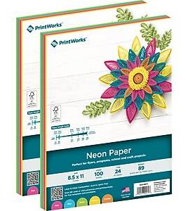 The Printworks neon paper is great for flyers, signs, report covers, school and craft projects that really pop. The five vibrant colors of yellow, blue, green, pink, and orange make it perfect for crafting vibrant works of art. This 24 lb. (89gsm) paper is slightly heavier than standard copy paper yet lightweight enough for origami, flyers, posters, folded projects, paper quilling, and more. Guaranteed to give impactful results on all printers and copiers, this paper is also acid- and lignin-free for archival-quality prints. You can print responsibly knowing that this paper is made with FSC certified wood fibers from responsibly managed North American forests. Whether used at home, in the office, or in class, this paper is perfect for all your craft needs. - Copy paper in five neon colors: yellow, blue, green, pink, and orange - Paper weight: 24 lbs. (89gsm) - Sheet dimensions: 8.5 x 11 - 100 sheets per ream - Paper is acid- and lignin-free for long-lasting results - Meets or exceeds the FSC standard - Neon colors allow you to create high-impact flyers, signs, school and craft projects, and more - Works great with all brands of inkjet and laser printers and copiers - Compatible for use with desktop cutting machines - Made in the USA Packaging: Reusable