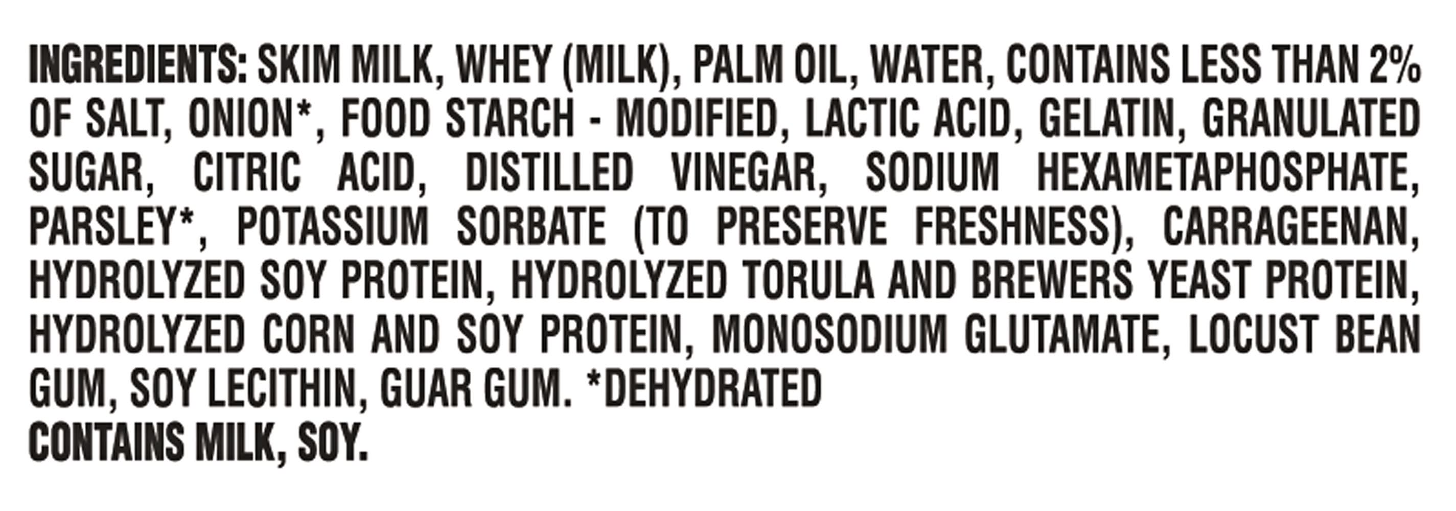Ingredients: SKIM MILK, WHEY (MILK), PALM OIL, WATER, CONTAINS LESS THAN 2% OF SALT, ONION*, FOOD STARCH - MODIFIED, LACTIC ACID, GELATIN, GRANULATED SUGAR, CITRIC ACID, DISTILLED VINEGAR, SODIUM HEXAMETAPHOSPHATE, PARSLEY*, POTASSIUM SORBATE (TO PRESERVE FRESHNESS), CARRAGEENAN, HYDROLYZED SOY PROTEIN, HYDROLYZED TORULA AND BREWERS YEAST PROTEIN, HYDROLYZED CORN AND SOY PROTEIN, MONOSODIUM GLUTAMATE, LOCUST BEAN GUM, SOY LECITHIN, GUAR GUM. *DEHYDRATED CONTAINS: MILK, SOYBEAN.