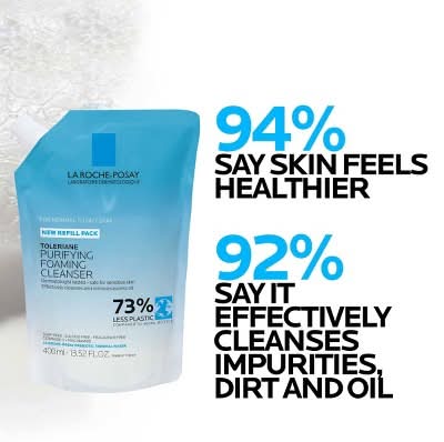 Toleriane Purifying Foaming Face Cleanser Refill is a daily face wash for normal to oily, sensitive skin. Formulated with La Roche-Posay prebiotic thermal spring water, niacinamide, and ceramide-3, this face wash gently cleanses skin of dirt, makeup, and impurities while maintaining the skin's natural moisture barrier and pH. Purifying foaming face wash cleanses skin of dirt, makeup, and impurities Removes excess oil while maintaining the skin's natural moisture barrier and pH Made with 73% less