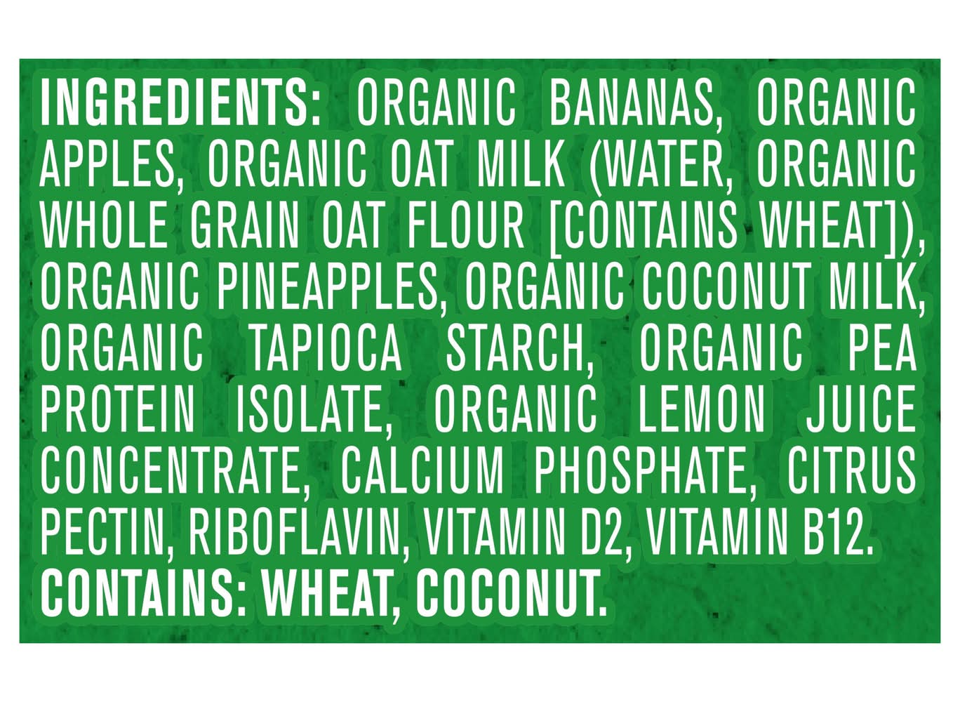Organic Bananas, Organic Apples, Organic Oat Milk (Water, Organic Whole Grain Oat Flour [Contains Wheat]), Organic Pineapples, Organic Coconut Milk, Organic Tapioca Starch, Organic Pea Protein Isolate, Organic Lemon Juice Concentrate, Calcium Phosphate, Citrus Pectin, Riboflavin, Vitamin D2, Vitamin B12 Contains: Wheat, Tree Nuts, Coconuts, Oat, Milk