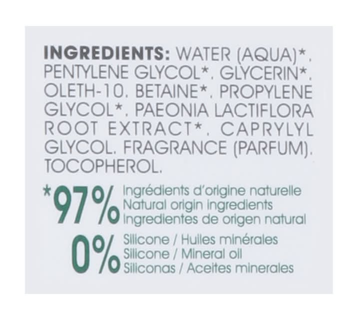 Water (Aqua) (97% Natural Origin Ingredients), Pentylene Glycol, Glycerin (97% Natural Origin Ingredients), Oleth-10, Betaine, Propylene Glycol (97% Natural Origin Ingredients), Paeonia Lactiflora Root Extract (97% Natural Origin Ingredients), Caprylyl Glycol, Fragrance (Parfum), Tocopherol