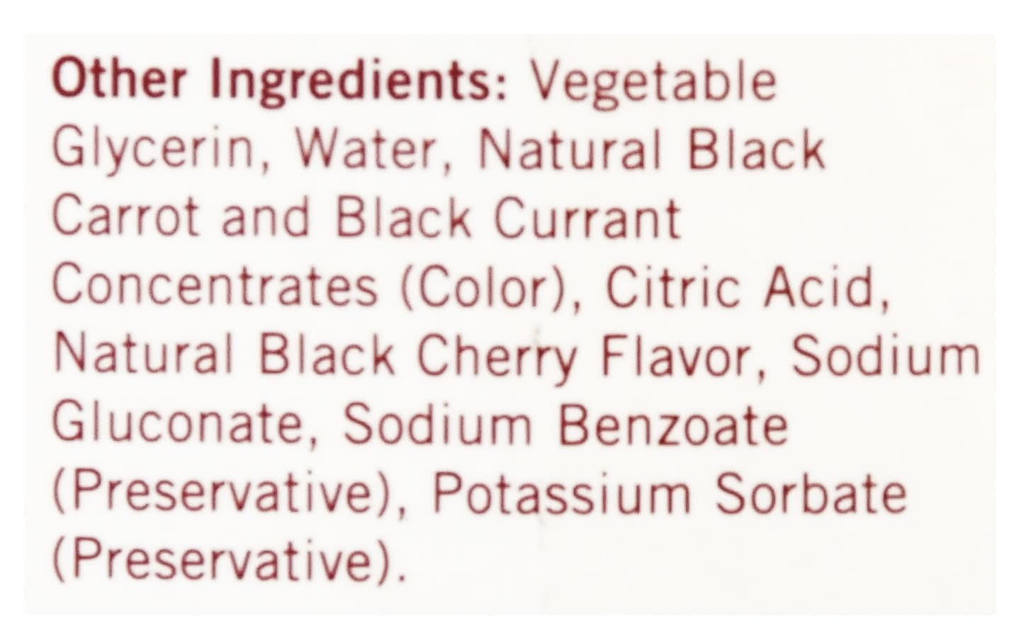 Other Ingredients: Vegetable Glycerin, Water, Natural Black Carrot And Black Currant Concentrates (Color), Citric Acid, Natural Black Cherry Flavor, Sodium Gluconate, Sodium Benzoate (Preservative), Potassium Sorbate (Preservative)