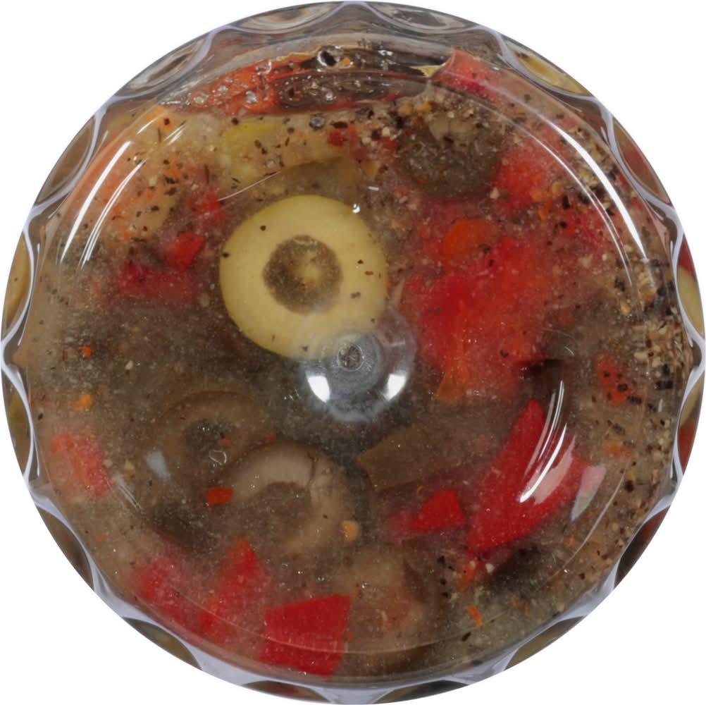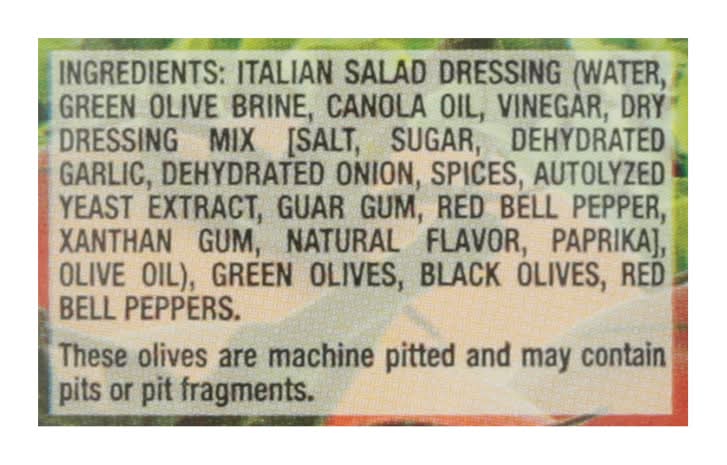 Italian Salad Dressing (Water, Green Olive Brine, Canola Oil, Vinegar, Dry Dressing Mix [Salt, Sugar, Dehydrated Garlic, Dehydrated Onion, Spices, Autolyzed Yeast Extract, Guar Gum, Red Bell Pepper, Xanthan Gum, Natural Flavor, Paprika), Olive Oil), Green Olives, Black Olives, Red Bell Peppers Additives: None