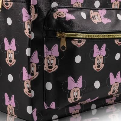 This Disney Minnie Mouse Backpack features an eye-catching all-over Minnie Mouse print. This backpack features one main compartment and one front accessory pocket for smaller items. Adjustable shoulder straps for carrying comfort. This backpack is perfect for carrying all your essentials, it is a must-have for any Minnie Mouse fans. • Color: Black • Size: 16 in