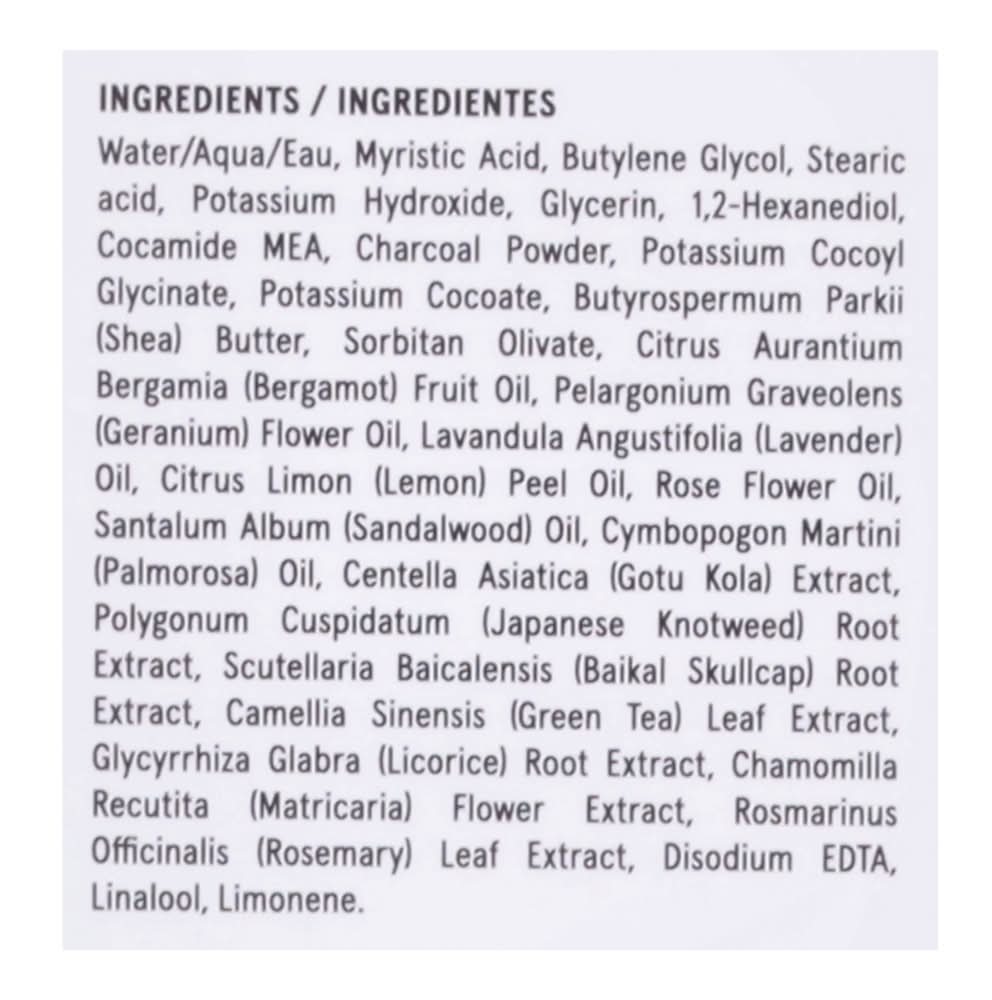 Water/Aqua/Eau, Myristic Acid, Butylene Glycol, Stearic Acid, Potassium Hydroxide, Glycerin, 1.2 – Hexanediol, Cocamide MEA, Charcoal Powder, Potassium Cocoyl Glycinate, Potassium Cocoate, Butyrospermum Parkii (Shea) Butter, Sorbitan Olivate, Citrus Aurantium Bergamia (Bergamot) Fruit Oil, Pelargonium Graveolens (Geranium) Flower Oil, Lavandula Angustifolia (Lavender) Oil, Citrus Limon (Lemon) Peel Oil, Rose Flower Oil, Santalum Album (Sandalwood) Oil, Cymbopogon Martini (Palmorosa) Oil, Centella Asiatica (Gotu Kola) Extract, Polygonum Cuspidatum (Japanese Knotweed) Root Extract, Scutellaria Baicalensis (Baikal Skullcap) Root Extract, Camellia Sinesis (Green Tea) Leaf Extract, Glycyrrhiza Glabra (Licorice) Root Extract, Chamomilla Recutita (Matricaria) Flower Extract, Rosmarinus Officinalis (Rosemary) Leaf Extract, Disodium EDTA, Linalool, Limonene Contains: Tree Nuts, Sheanuts