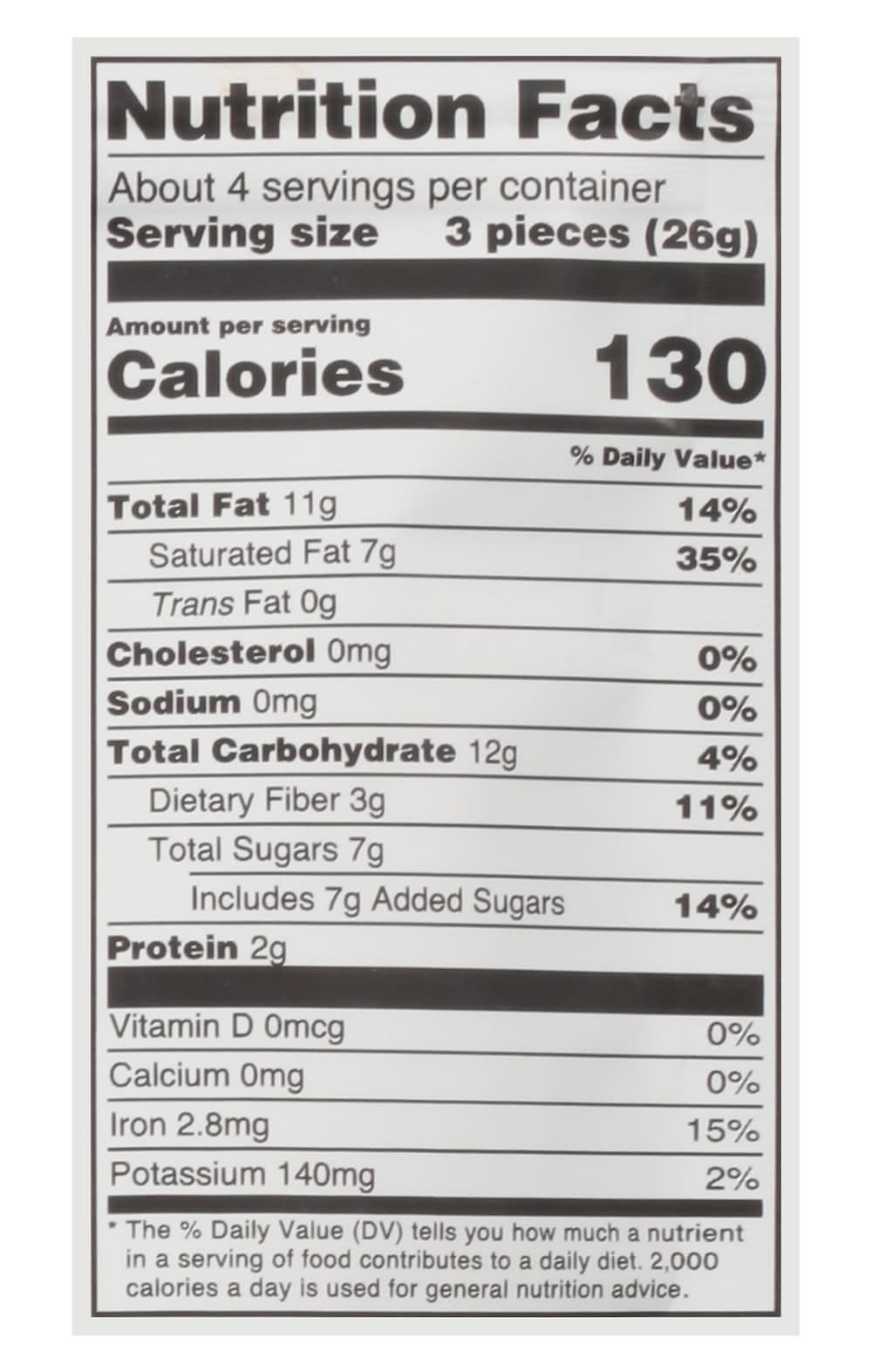 Organic Chocolate Liquor (Rainforest Alliance Certified-a Better Future for People and Nature, www.ra.org), Organic Cane Sugar, Organic Cocoa Butter (Rainforest Alliance Certified-a Better Future for People and Nature, www.ra.org), Organic Lecithin (Soy), Organic Vanilla Extract Contains: Soybeans, Peanuts, Tree Nuts, Milk