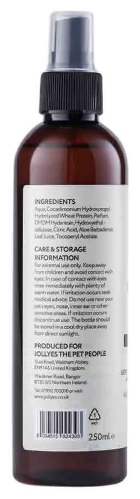 Ideal for use in between washes, These helps to remove knots and tangles from your dogs coat whilst leaving it smelling fresh. Free from artificial colors, parabens, silicones and alcohol this vegan friendly formulation is gentle enough that it doesn’t strip natural oils from your dogs coat. With aloe vera leaf juice and vitamin E to support a healthy skin and coat. Shake the bottle before use. Remove the cap and spray all over your dogs coat, working from the back of the head to tail. As you spray the scent, ruffle your dogs coat to ensure the spray is rubbed in. Replace the cap after use and wash your hand. Packaging: Reusable