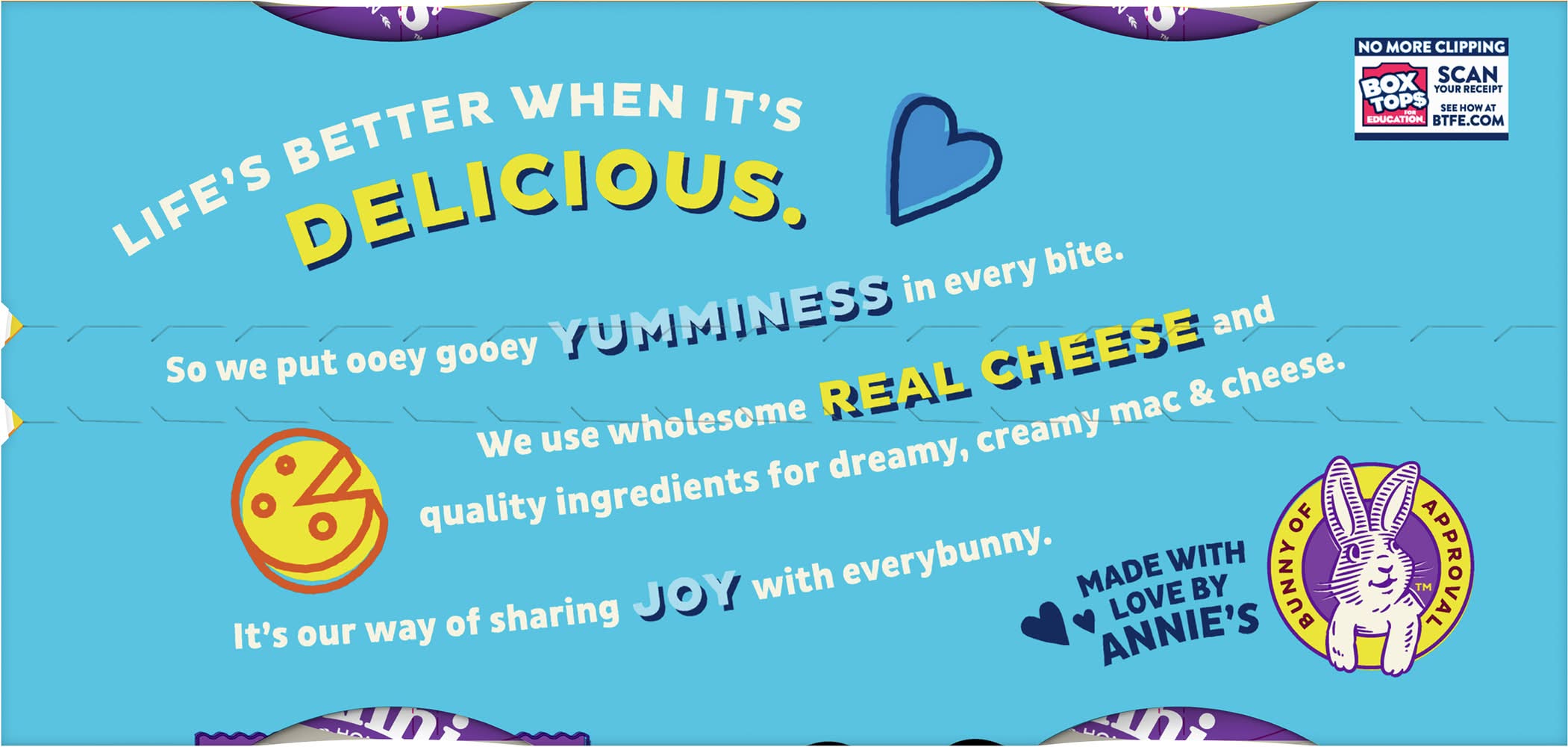 Whole Grain: 8 g or more per serving. Eat 48 g or more of whole grains daily. wholegrainscouncil.org. Certified Organic by Quality Assurance International. Bunny of approval. 3 yummy shapes! Enjoy. Life's better when it's delicious. So we put ooey gooey yumminess in every bite. We use wholesmome real cheese and quality ingredients for dreamy, creamy mac & cheese. It's our way of sharing joy with everybunny. Made with love by Annie's. Hoppiness starts here. WholeGrainCouncil.org. www.disney.com. Learn more at DisneyCheck.com. Visit Annies.com to learn more about our commitment to a better planet and to get a fun Annie's sticker. We love to hear your feedback! Contact us at Annies.com or 1-800-288-1089 and reference the best if used by date. Box Tops for Education: No more clipping. Scan your receipt. See how at BTFE.com. We reduce our Bunny Footprint by using: Certified 100% recycled paperboard. Recyclable. For our cartons. Please reduce your bunny footprint, too! Annie's, Inc.,