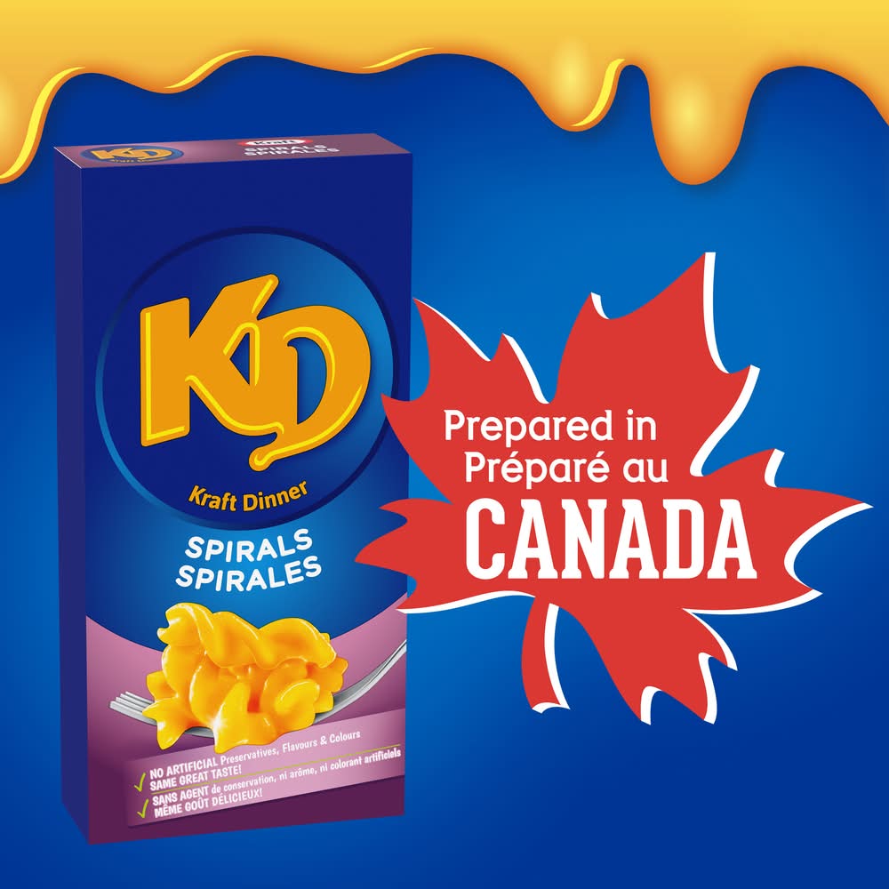 Kraft Dinner Macaroni & Cheese Spirals combines classic KD cheese with spiral noodles for a deliciously creamy meal! When you see the familiar, cheesy KD on the package you know that this macaroni & cheese classic is sure to put a smile on your family's faces. With its iconic cheesy flavour, Kraft Dinner Macaroni & Cheese Spirals is the taste you know and love with no artificial preservatives, flavours or colours. Production - Kraft Heinz Company - ProductXM,