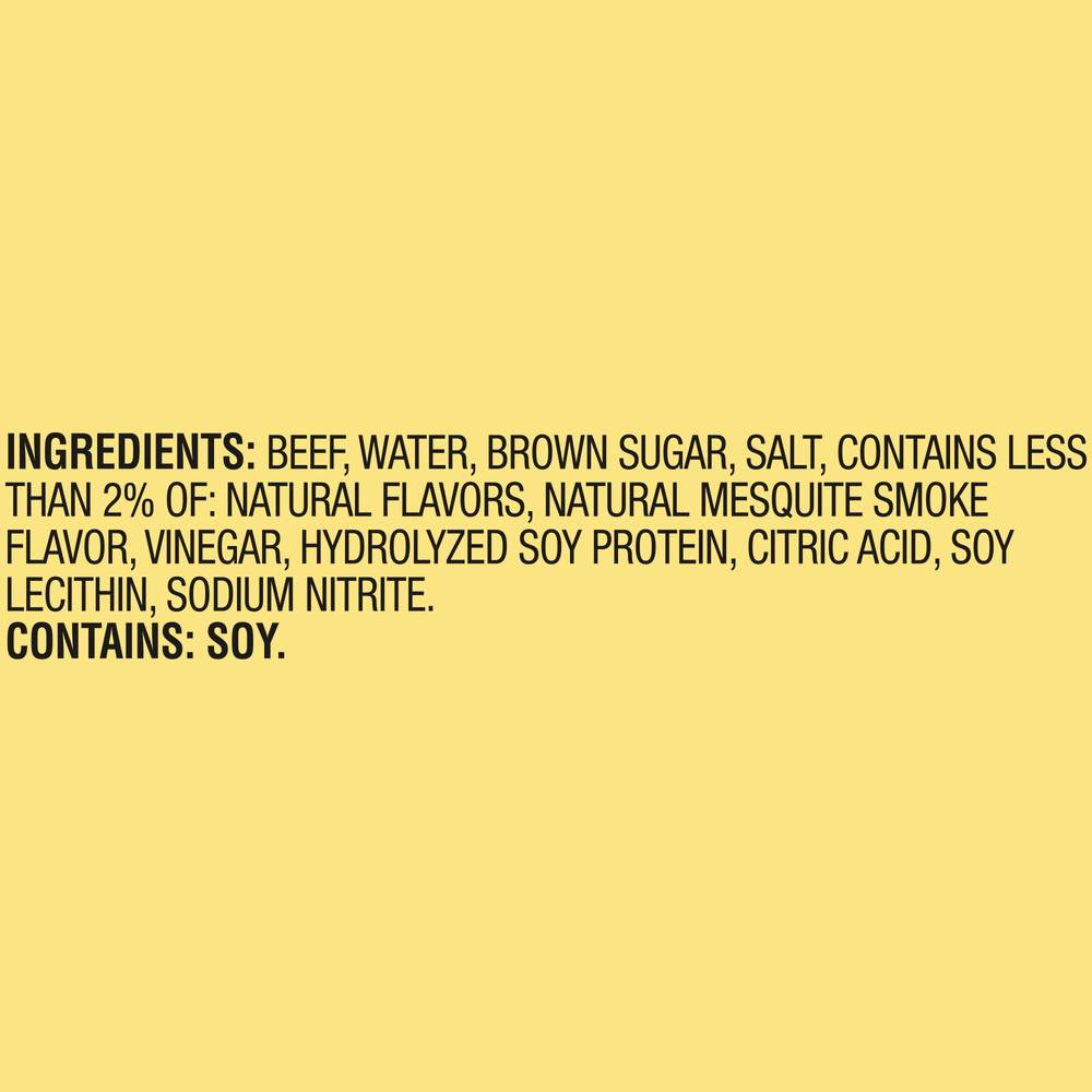 Beef, Water, Brown Sugar, Salt, Contains less than 2% of: Flavorings, Natural Mesquite Smoke Flavor, Distilled Vinegar, Hydrolyzed Soy Protein, Citric Acid, Sodium Nitrite. CONTAINS: SOY. Contains: Soy