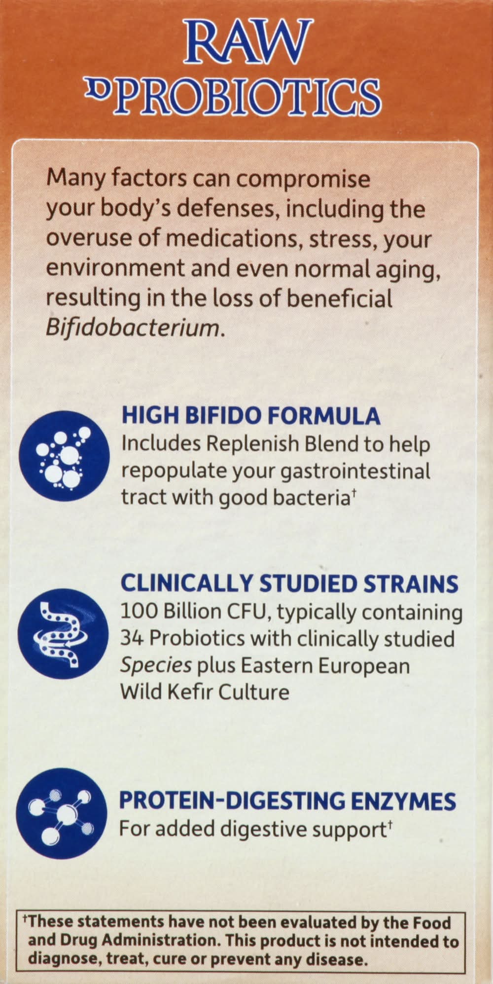 Whole Food Supplement. Certified gluten-free by NSF. Non GMO Project verified. nongmoproject.org. Independent third party verification. 100 billion guaranteed. 34 probiotic strains. Ultimate replenishing probiotic. Clinically studied replenish blend to restore the Good Bacteria Lost. Once daily. Raw probiotics ulimate care potency promise. What we promise on the label is what you get - 100 billion live probiotic cultures in a convenient once daily serving (At Expiration Date under recommended storage conditions). Maintaining a healthy bacterial balance in your digestive system is key to optimizing your overall well-being. Shelf Stable (At Expiration Date under recommended storage conditions): New desiccant-lined bottle technology for shelf stable probiotics. Many factors can compromise your body's defenses, including the overuse of medications, stress, your environment and even normal aging, resulting in the loss of beneficial bifidobacterium. High Bifido Formula: Includes replenish blend to help repopulate your gastrointestinal tract with good bacterial. Clinically Studied Strains: 100 billion CFU, typically containing 34 probiotics with clinically studied Species plus Eastern European Wild Kefir Culture. Protein-Digesting Enzymes: For added digestive support. No binders, fillers, carriers, nor artificial colors or preservatives. www.gardenoflife.com. We buy 100% certified renewable energy. Certified Renewable Energy. Green-e.org. Printed with vegetable based inks on 100% recycled material. (These statements have not been evaluated by the Food and Drug Administration. This product is not intended to diagnose, treat, cure or prevent any disease.) Made in the USA from foods grown in the USA and other countries. Packaging: Reusable