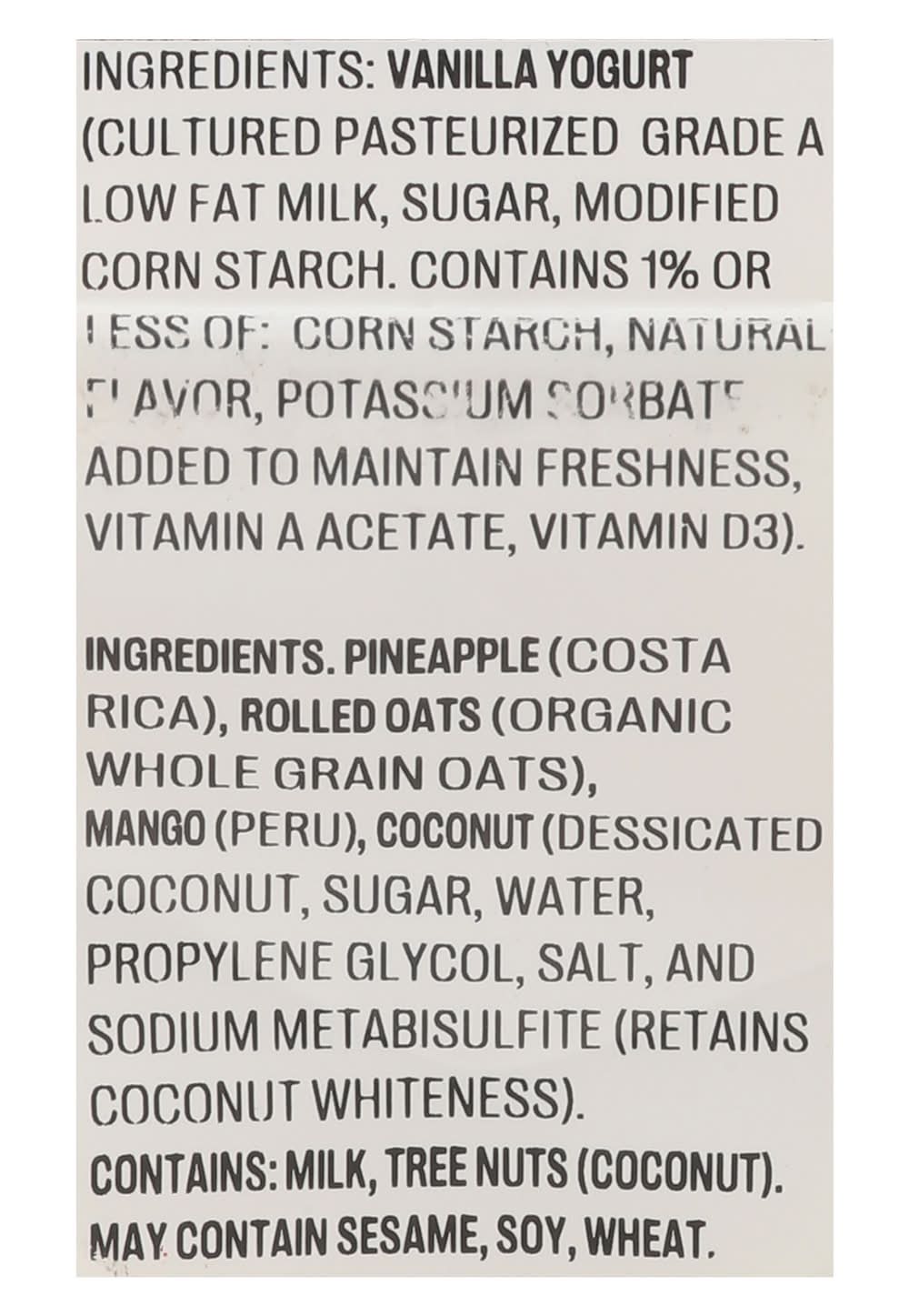 Ingredients: Vanilla Yogurt (Cultured Pasteurized Grade A Low Fat Milk, Sugar, Modified Corn Starch. Contains 1% or Less of: Corn Starch, Natural Flavor, Potassium Sorbate Added to Maintain Freshness, Vitamin A Acetate, Vitamin D3). Contains Bioengineered Food Ingredients. Pineapple (Costa Rica), Rolled Oats (Organic Whole Grain Oats), Mango (Peru), Coconut (Dessicated Coconut, Sugar, Water, Propylene Glycol, Salt, and Sodium Metabisulfite (Retains Coconut Whiteness) Contains: Milk, Tree Nuts, Tree Nuts, Coconuts, Oat, Sulfites, Sesame, Soybeans, Wheat