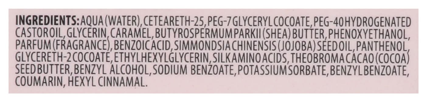 Aqua (Water), Ceteareth-25, PEG-7 Glyceryl Cocoate, PEG-40 Hydrogenated Castor Oil, Glycerin, Caramel, Butyrospermum Parkii (Shea) Butter, Phenoxyethanol, Parfum (Fragrance), Benzoic Acid, Simmondsia Chinensis (Jojoba) Seed Oil, Panthenol, Glycereth-2 Cocoate, Ethylhexylglycerin, Silk Amino Acids, Theobroma Cacao (Cocoa) Seed Butter, Benzyl Alcohol, Sodium Benzoate, Potassium Sorbate, Benzyl Benzoate, Coumarin, Hexyl Cinnamal Contains: Tree Nuts, Sheanuts