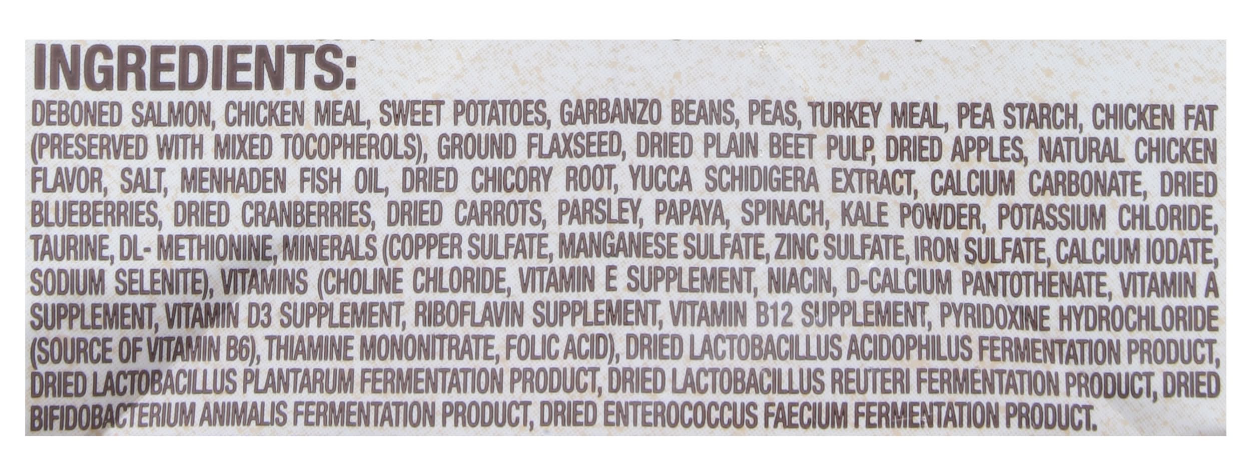 Deboned Salmon, Chicken Meal, Sweet Potatoes, Garbanzo Beans, Peas, Turkey Meal, Pea Starch, Chicken Fat (Preserved with Mixed Tocopherols), Ground Flaxseed, Dried Plain Beet Pulp, Dried Apples, Natural Chicken Flavor, Salt, Menhaden Fish Oil, Dried Chicory Root, Yucca Schidigera Extract, Calcium Carbonate, Dried Blueberries, Dried Cranberries, Dried Carrots, Parsley, Papaya, Spinach, Kale Powder, Potassium Chloride, Taurine, DL- Methionine, Minerals (Copper Sulfate, Manganese Sulfate, Zinc Sulfate, Iron Sulfate, Calcium Iodate, Sodium Selenite), Vitamins (Choline Chloride, Vitamin E Supplement, Niacin, D-Calcium Pantothenate, Vitamin A Supplement, Vitamin D3 Supplement, Riboflavin Supplement, Vitamin B12 Supplement, Pyridoxine Hydrochloride (Source of Vitamin B6), Thiamine Mononitrate, Folic Acid), Dried Lactobacillus Acidophilus Fermentation Product, Dried Lactobacillus Plantarum Fermentation Product, Dried Lactobacillus Reuteri Fermentation Product, Dried Bifidobacterium Animalis Fermentation Product, Dried Enterococcus Faecium Fermentation Product Contains: Fish, Salmon, Fish